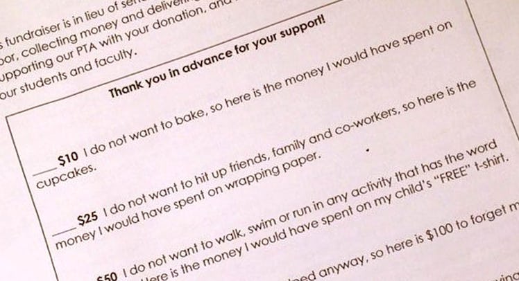 Parents universally loathe a school fundraiser. But it looks like the end of parent-supported cupcake mongering and something-a-thoning may have finally arrived. One Redditor using the handle Charlie_Olliver posted a hilariously straightforward letter from the PTA at his son’s elementary school, in which the organization has given up decorum for forthrightness. Instead of having parents and kids hoof it door to door while their kids sell seasonal wrapping paper or overpriced scented candles the PTA just simply asked parents to pony up a donation.