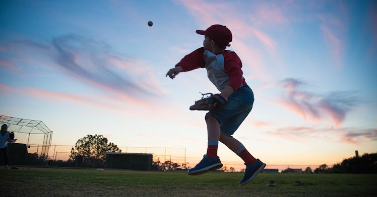 For throwing a ball, specifically a baseball, Hill recommends using the “L-Method.” Essentially, you want to teach your kid to use their throwing hand as a catapult, making sure they position their hand down similar to the way a pitcher does, down and through as they’re coming through the ball. In the L-Method, you basically hold both hands right at the elbows in an L shape, Hill explains. “You’re trying to over-accentuate that shoulder rotation.”