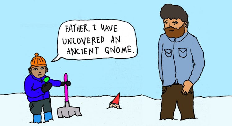 With the warmly dressed child in tow (waterproof pants are key here), lead the kid into the yard and begin by explaining that you’re going to build a snow castle or snowman ⏤ something simple but that requires digging. Once they start, dig down to the one marked toy and enthusiastically exclaim that you’ve found something, and that you need their help. Quick, come here! Ask them to help you dig up the dinosaur or prehistoric tiger or 100,000-year-old Farmer Jane and, as you do, get the game/story rolling. You’ve just uncovered some ancient fossils! This is amazing! There must be more in the area, let’s find them all!
