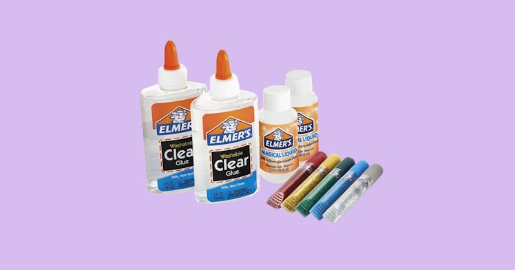 This kit comes with two bottles of Elmer’s glue, two bottles of “magical liquid activator solution,” and five glitter glue pens. The glue is clear, and when combined with the solution it makes a transparent slime base that kids can add glitter to. It’s a simple way to make a quality slime.