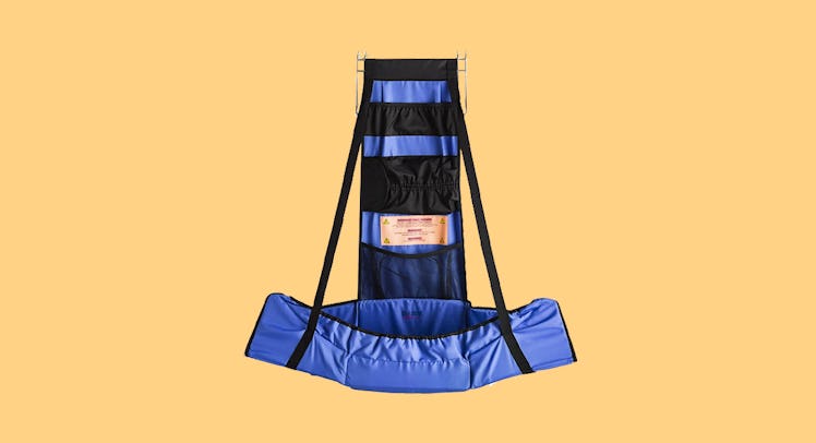 If you’ve ever seen pictures of rock climbers sleeping on the side of a mountain, just crazy dangling there in one of those portaledge tents, then you know exactly how it works. Essentially, the Baby Change-N-Go is a portable hammock-like changing station that hangs over the side of a door or bathroom stall to create a 34-inch long nylon basket in which your baby can rest securely (belted in) while you change their diaper and/or check the score of the game.