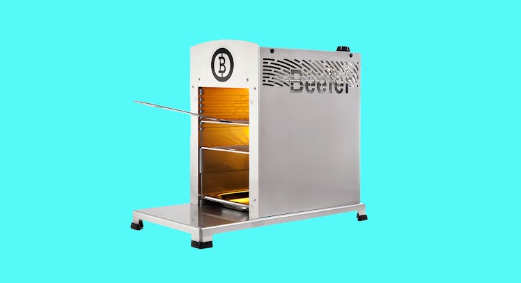 Just when we’d thought we’d seen everything in the grill category, from smart grills to the ultra-portable (and stackable!) cube grills, we came across the Beefer. This German-made propane grill has one trick, but it’s a damn good one: It gets hot. Really hot. It reaches a mind-boggling, steak-sizzling, burger-browning 1,500 degrees Fahrenheit. For reference, rock turns to molten lava starting at 1,300 degrees Fahrenheit.