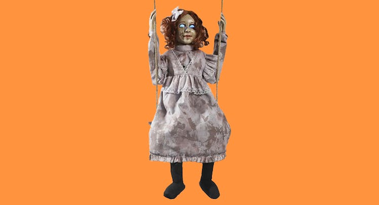 The hallowed-out eyes glow blue, her head turns side to side, and she speaks in haunting phrases ⏤ all while swinging eerily back and forth in the front yard. Even better, this doll has an integrated infrared sensor and automatically turns on whenever someone approaches.
