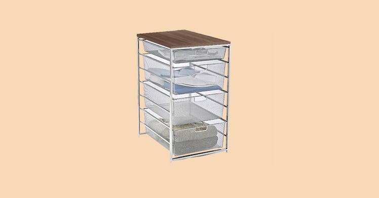 The easiest way to get that custom closet feel, per Tobia, is via this storage system. The unit has three large and one small wire mesh drawers that you can use to store such non-everyday items as small accessories (the tight wire weave means things won’t fall out) to sports clothing. It’s made from steel so it’s durable and the large wooden top gives you another place to store stuff.
