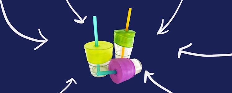 Siliskin tops come in packs of three. They’re made of 100 percent silicone and are available with either a spout-style lid or a straw-top. Thanks to the grippy silicone, the tops slide in easily but create a nearly air-tight seal that stays on when being slurped from and that’s tricky for little fingers to pry off (don’t kid yourself, they’ll get curious and try at some point). Yes, both variations have an opening, which means that if the entire cup goes flying, liquid will go flying too. But the side-seal is snug enough to prevent standard spills.