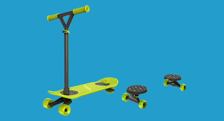 The whole concept is pretty straightforward: The MorfBoard is an 8-inch plastic yellow skateboard deck (smaller than traditional boards for younger riders) with a cored-out truss pattern (for a stickier grip) and two giant holes, in which different wheelsets can be locked in place depending on what your kid wants to ride (MorfBoard calls these exTensions.) So if it’s a skateboard day, simply drop in the 53mm skate wheels with aluminum alloy trucks and twist until they click. The patented “Lock & Release” system ensures the wheels latch safely place, and removing them is just as easy ⏤ press the button and turn. It takes a few seconds at most. To convert to a scooter (which has fatter wheels), you’d also lock in the fully adjustable handlebars and pressure foot brake.