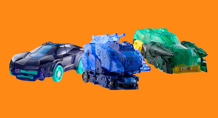 Essentially, Screechers are race cars/trucks that transform into robots ⏤ or “part hot rods, part animal spirit avatars.” Except, like Mecards, instead of just twisting and turning them into droids, you have to drive them into/over an object on the table ⏤ in his case, a plastic disc. When the spring-loaded car hits the disc, it skyrockets into the air and does a 360-degree flip, landing as a battle-tested robot ready to tear things up.