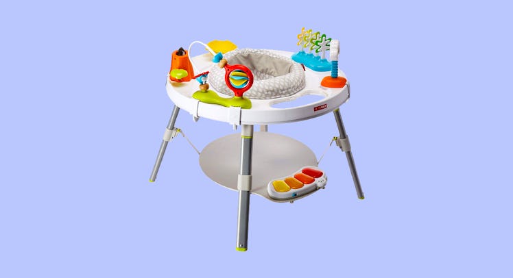 Once your baby can hold his or her head up, put him or her in this activity center. It’s fully loaded with a squeaking cloud, a rattling lamb, swaying stars, and spinning bead toys. The weight limit is 25 pounds and when your baby outgrows it, it converts into a toddler table.