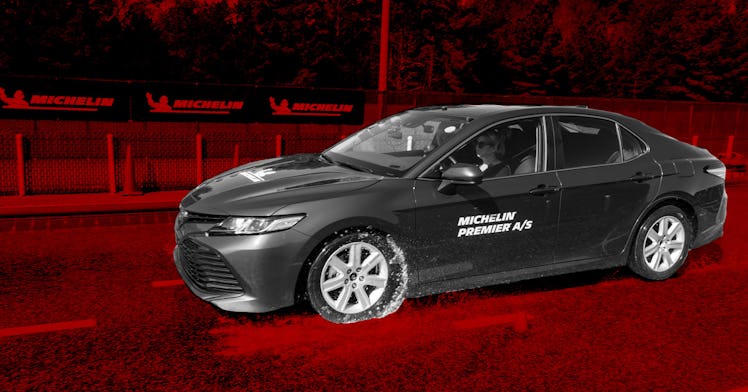 It’s a sunny spring day at the 3,500-acre Laurens Proving Grounds in South Carolina, where Michelin has been testing tires since 1976. The cruise control is set at 45 mph, which feels pretty fast when you’re barreling between traffic cones down a test track with sprinklers dousing the asphalt, waiting for the signal to hit the brakes. I’m not on Michelin tires for this run, but those of a close competitor. Both this and the Michelin sets I was recently driving on are buffed-down nearly to the end of their lifespan.