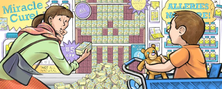 One Facebook allergy group member, a father of a 15-month-old son who has an anaphylactic allergic reaction to sesame seeds, peanuts, cashew nuts, and pistachios, offered his story as evidence: “I’m pretty skeptical,” says the man who asked to remain anonymous. He and his wife follow the doctor’s instructions and do their own research when it comes to allergy treatments or restaurant menu tips they read online. A lot of that research starts for them in Facebook groups for allergy parents which sometimes offer well-cited information that they then verify. But there are also plenty of too-good-to-be-true posts and ads that, he admits, can be hard to resist. “I have to say, as a dad with an allergic son, I really wish I could believe the headlines and wish I could think ‘Oh, he’s going to be OK, they’ve found a cure.’ Since allergies are still somewhat a science mystery,” he says, “it’s ripe territory for clickbait and false information posing as ‘science.’”