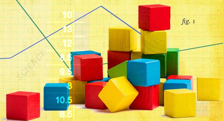 Although there’s scant evidence that dedicated STEM toys give children an academic edge, play with simple, wooden blocks appears to be correlated with achievement in the classroom. The data below derive from a 2001 study, which followed 37 preschoolers from 1982 until they graduated high school in 1998. Preschoolers who scored high on a “block performance measure” (indicating that they displayed high-quality play with wooden blocks) performed slightly better on standardized tests and obtained slightly higher teacher-awarded grades than their peers.