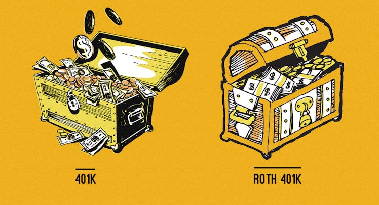 With a traditional 401K, you pay taxes when you take your money out of the account. With a Roth, you pay the taxes before you invest the money — so whenever you’re ready to draw your investment savings out during retirement, there are no taxes to pay. According to Egan, the way to choose which option is right for you is to determine which tax bracket you’re in now and which bracket you’ll be in retirement.