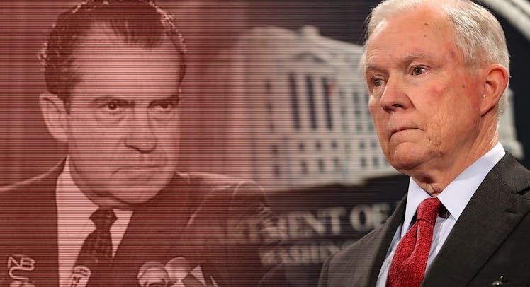 Sessions’ priorities, it seems, are not on fighting actual violence but rather rescinding the protections that have allowed the multi-billion dollar recreational marijuana industry to flourish in five of our country’s states. Not only that, but the market has been pining for it: Shortly after Trump ascended to the presidency, the private prison industry’s stocks have been booming, largely because another Obama-era policy that signaled the end of private prisons was overturned. And now that private prisons are once again hungry for more human souls, Jeff Sessions needs to find a way to fill them. So why not borrow from a tradition from his conservative forefather, Nixon?