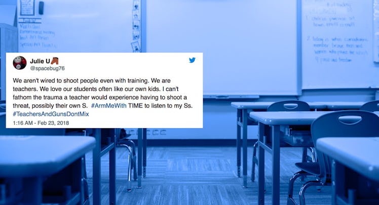 Following the shooting at Marjory Stoneman Douglas High in Parkland, Florida, which left 17 teenagers and educators dead and a nation and community in mourning, a national conversation about gun control and schools has taken the nation’s attention. One of the most popular — and misguided — refrains when it comes to talking about gun control is that we should be training and arming educators with firearms so they can ward off or suppress any attacks on students in the event of a mass shooter situation. A lot of teachers, however, didn’t really care for that suggestion.