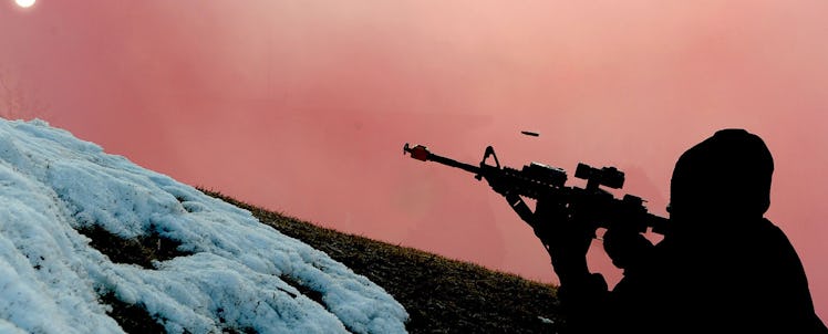 One day, however, after another crop of cadets filed into the woods, something different happened. A Humvee I hadn’t seen before emerged from the tree line and parked at the top of the hill where the helicopters would normally land. Two men, also in camo, hopped out of the truck. They seemed less formal than the cadets I’d been studying. They held bigger-looking rifles rather casually from the hip. They were spitting out chewing tobacco. They appeared a lot older than the cadets, too. These new guys inspected how the grass was pushed down. I started to backtrack down the hill to home.