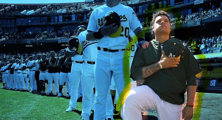 Over the weekend, Oakland A’s catcher Bruce Maxwell became the first MLB player to take a knee during the National Anthem. Unsurprisingly, the decision has attracted a lot of controversy. While many may not support Maxwell’s protest, he can take solace in knowing he still has the support from one fan: his dad, army veteran Bruce Maxwell Jr.