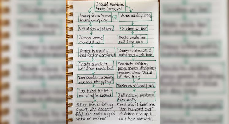 People on social media are furious over a viral Facebook post detailing the differences between working moms and stay-at-home moms. Shared by conservative Christian blogger Lori Alexander of The Transformed Wife, the flowchart, titled “Should Mothers Have Careers?”, explains a day in the life of each type of mom.