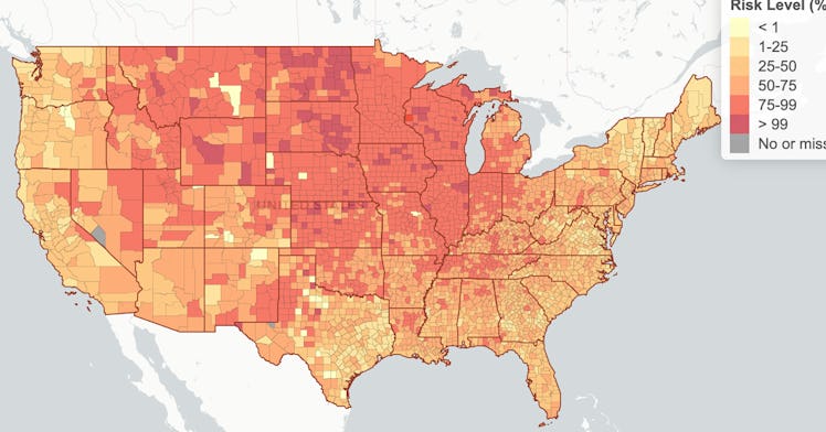 The tool uses available data — and assumes that there are likely five times as many cases as actually being reported in real-time — to help you figure out just how risky your gathering might be if it happens in the continental United States (Hawaii, Alaska, and Puerto Rico aren’t featured on the map).