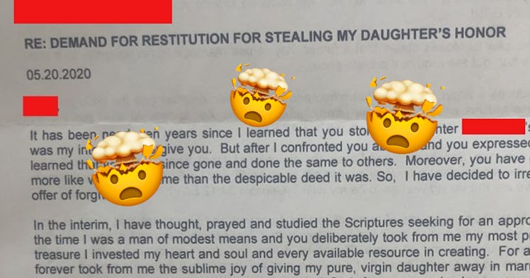 A particularly noxious ideology posits that a daughter is basically the property of her father, that her value derives from her virginity which can only be given to her husband by her father or stolen away by a scoundrel. It’s completely out of touch with modern culture, which is why one dad’s bonkers letter espousing these ideas quickly went viral yesterday.