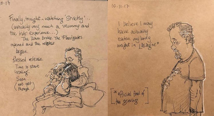 The drawings show the ups and downs of life since his wife’s unexpected passing (she entered the hospital with flu-like symptoms and died of organ failure), such as dealing with the “grief rollercoaster.”