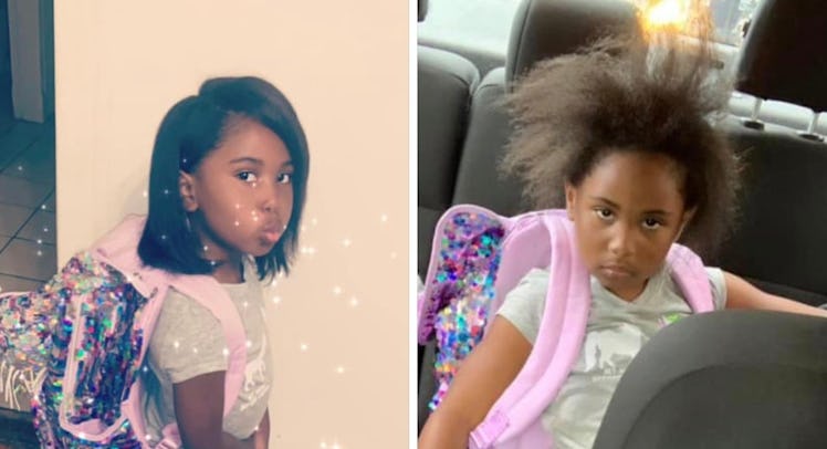 The first one shows how hair carefully straightened in the morning can look wild by the end of the first day of kindergarten, and a kid in a sparkly backpack looks way funnier when they’re clearly not feeling too sparkly.