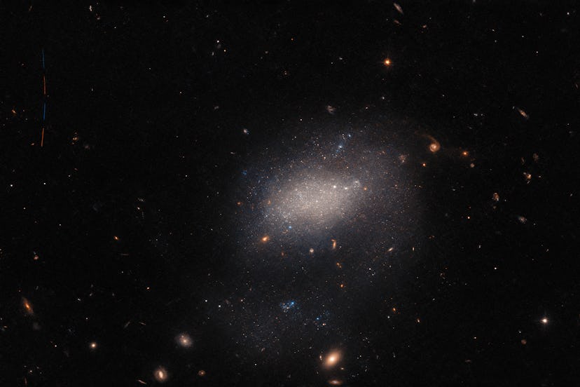 “Irregular dwarf galaxies are often chaotic in appearance, with neither a nuclear bulge — a huge, tightly packed central group of stars — nor any trace of spiral arms — regions of stars extending from the center of the galaxy,” NASA and ESA share.