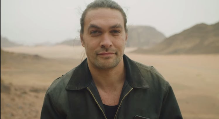 “Bye Drogo! Bye Arthur Curry!” he yells standing in the middle of the desert somewhere as the electric beard trimmer first hits his face. Clad in a black bomber jacket and black-and-white striped pants that make him look like he escaped prison in the ’30s, Momoa shaves his beard and says some stuff.