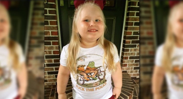 Kelsey Dawn Williamson wanted to get her daughter Salem a popular Frog and Toad t-shirt and she ordered one online from Ali Express, a Chinese retailer. However, when the shirt came, Kelsey was surprised to find that written beneath the photo of the titular frog and toad riding bikes was the message: “Fuck The Police.”