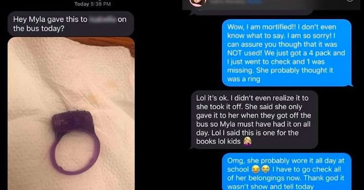 Humor is essential in this situation while respecting the mom who may be concerned that her daughter received this on the school bus and Maneely’s response to the inquiring parents was very honest. “Wow, I am mortified!!” she starts off the text. “I don’t even know what to say. I am so sorry! I can assure you though that it was NOT used, “ she explained saying her daughter probably thought it was a ring.