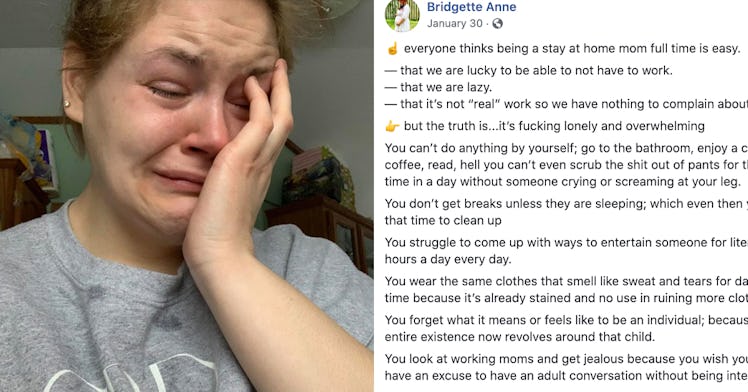 The poster, a Facebook user named Bridgette Anne, begins her January 30 post by outlining some of people’s assumptions about stay-at-home parenting, especially stay-at-home moms (SAHM), “Everyone thinks being a stay at home mom full time is easy.” But the truth, she says, is that “it’s fucking lonely and overwhelming.”