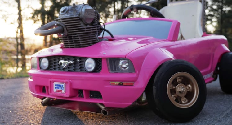 Barbie ride-on cars and Jeeps absolutely weren’t meant to hit 70 miles per hour ⏤ most top out at a speedy 5mph. But what would happen if one did hit those kinds of speeds? That’s what one bold YouTuber, Edwin Olding of the DIY channel Grind Hard Plumbing Co, wanted to know. So he slapped a customized Honda dirt bike engine under the hood of a Barbie Power Wheels Ford Mustang, added a few old go-kart parts for safety and stuff, and then took to the open track. The results, which he posted in a video, were insane.