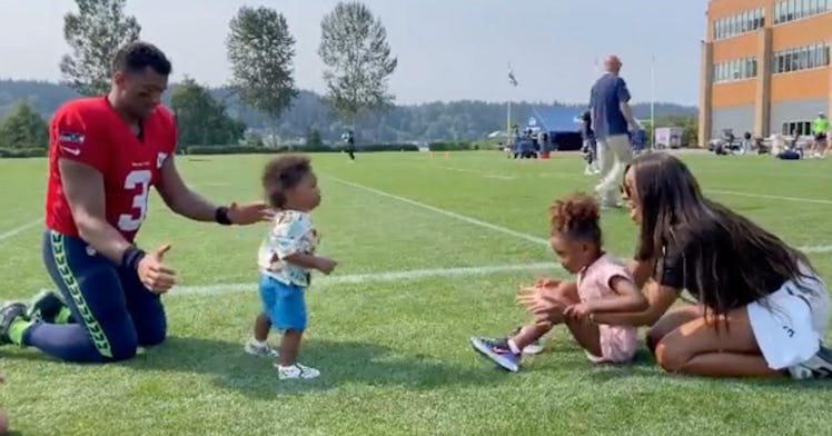 Russell Wilson’s son Win took the metaphorical first step in his NFL career by taking the literal first steps of his life during a Seattle Seahawks’ practice.