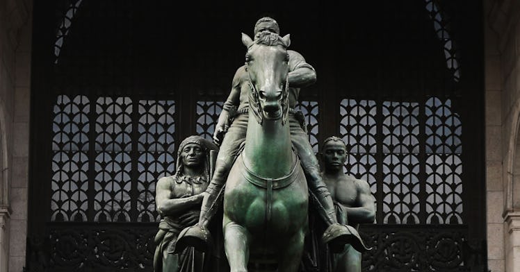 The statue has long been a target of activists who argue that the hierarchical nature of the statue — which features Roosevelt on horseback, walking ahead of the Native man and the African man, makes it a clear statement on race and perceived white superiority over people of color. In 2017, activists splashed red liquid at the base of the statue, representing blood, and called for its removal due to its status as an emblem of “patriarchy, white supremacy and settler-colonialism.”