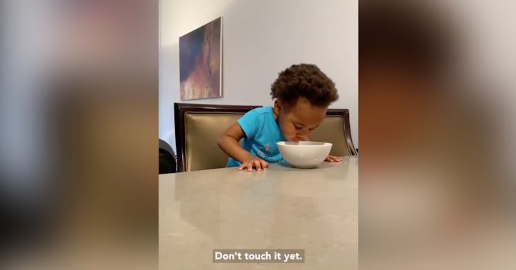 Over the past few weeks, a new viral video trend has hit Twitter called the “Fruit Snack Challenge.” The hit, which first went viral about five days ago when a mom hit record, poured a package of fruit snacks into a bowl for her toddler and then walked away and told her not to have any of the fruit snacks until she got back. The video, which clocks in at over a minute, is absolutely adorable — not just because the toddler is super cute, but also because her tested patience is successful. The mom walks away and, alone, the little girl talks to herself about how she can’t touch the fruit snacks, gives side-eyes towards the snacks, smells them, and asks herself, “Dada and mama, gone?” and “I must don’t touch.” Luckily, she prevails and gets to eat the fruit snacks. It is freaking adorable.