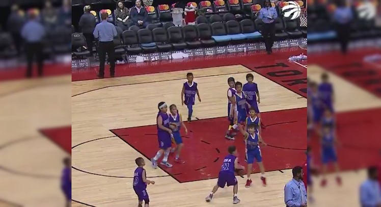 During halftime of the game between the New Orleans Pelicans and the Toronto Raptors on Monday night, one young player showed off some seriously impressive basketball skills in a video that’s going viral. The young baller, wearing a blue jersey with “21” on the back, dribbles down the length of the court and fakes out his opponents with a couple of crossovers before shooting and scoring, to the sound of the crowd’s roaring cheers.