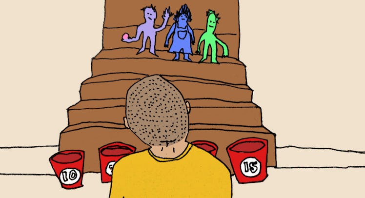 The first step is to attribute point values to each receptacle. On each sheet of paper, write a single number ⏤ 10, 20, 25, 30, 40, 50, 75, 100, etc. ⏤ and tape it to a bin. Any numbers will do, it just depends on how hard you want to make the math. After each bin has a label, arrange them at the bottom of the staircase in no particular order. Now, collect all the balls and deposit them at the top of the stairs. Again, how many bins or balls really depends on what you have around the house. The game works fine with only a few of each but rounds can last longer if you have more.