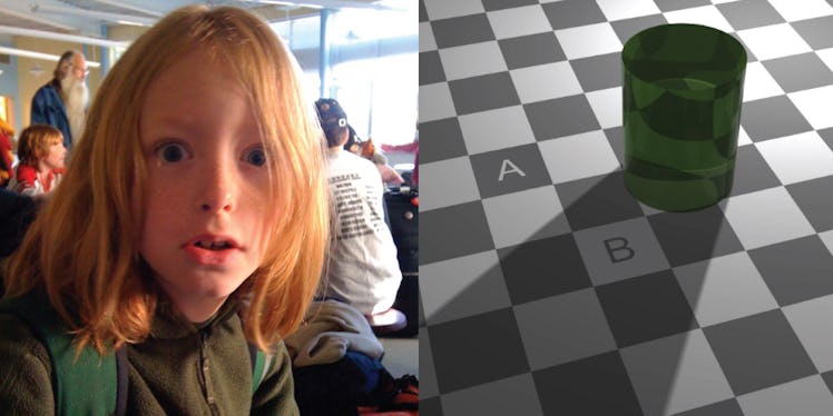 A and B are the same color. Really. But how? And how long before your kid unleashes the crayon box like, “Who’s the same color now?!” Two tricks make this illusion happen: First, surrounding like-colored squares with lighter or darker ones makes them appear darker or lighter by comparison, respectively. Second, soft edges and shadows mislead the eye, which, at this point, is like, “Dude, I’m an object perceiver, not a miracle worker … or light meter.”