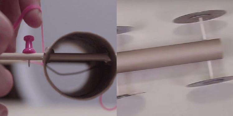 - Press 2 push pins in each of the dowels (on opposite sides). Use X-acto knife to create 2 parallel holes in the middle of the tube.