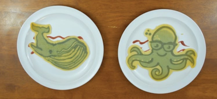 Once you’ve mastered the basics, elevate your art to museum quality by adding some color. Dump a box of blueberries into a blender, puree them, add a bit of water to smooth it out, collect the juice, and add it to a fourth squeeze bottle of batter. Turns out the same stuff that makes blueberries so nutritious also make them so blue, and it also turns out that blue is the perfect color for, like, all your kid’s favorite characters. Grover? Blue. Smurfs? Blue. R2D2? Blue highlights, and a super simple shape to draw, too!