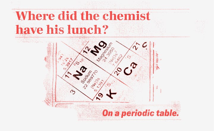 - Q: Where did the chemist have his lunch? / A: On a periodic table.