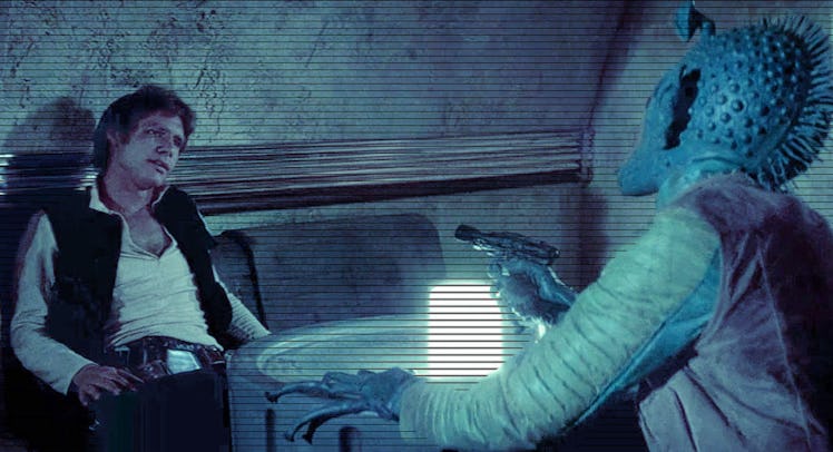 We all know the scene. In the original Star Wars, super smooth smuggler Han Solo agrees to transport Luke Skywalker and Obi-Wan Kenobi to Alderaan, so they can get Princess Leia’s stolen Death Star plans safely into the hands of the Rebel Alliance. But as Han is getting ready to head to the Millennium Falcon, he’s stopped in the Mos Eisley Cantina by Greedo, the green bounty hunter who plans to take Han back to Jabba the Hutt and collect the price on his head.