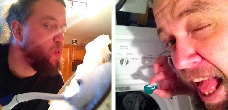 The first photo shows the husband washing the dishes while attempting to seduce the camera with his bedroom eyes. Next, he is doing everything he can to make dropping soap pods into the washing machine as sensual as possible. Things really kick up a notch in the third photo, though, when he shows that the washer is all ready for his “large load.” He even manages to somehow manages to make vacuum hot thanks to a clever, and suggestive, camera angle.