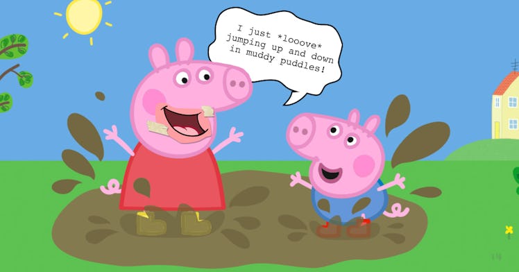Peppa’s most iconic line — on par with the line “Bond, James Bond” — is easily the phrase or variations on the phrase “I just looove jumping up and down in muddy puddles.” Here’s an example of how that goes down, if you are somehow unfamiliar.