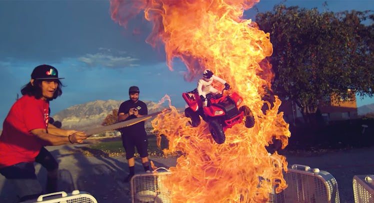 Now, despite how cool this stunt looks, you definitely probably shouldn’t try this one at home. Conjuring such a flame is precarious to say the least; the BeyondSlowMotion team is filled with professionals who know how to keep unnecessary accidents from happening. But, if you want to slow-mo some toys being flung over into a smaller fire? It’ll still look pretty cool. Just tell the kids that they might be melted.
