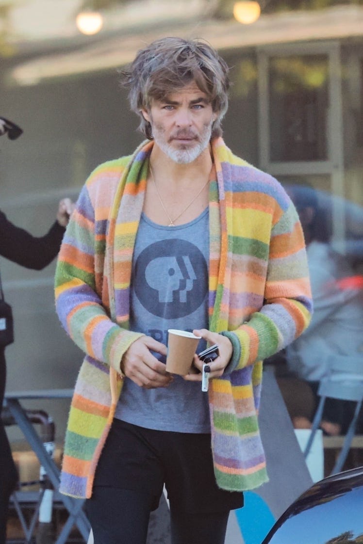 Who says fall weather fashion has to be earth tones only? Chris Pine is daring you to wear a rainbow sweater as you bundle up for the season. The charming and charismatic actor is not one to shy away from making bold statements, and his personal style is no exception. That’s why it’s no surprise that he went viral for a recent outfit — a brightly colored cardigan, replete with a PBS tank top and leggings. While the sweater — an ultra-colorful cardigan — may be out of reach for the rest of us (it’s almost $2,400!) there are plenty of dupes the most color-friendly dad can take into account.